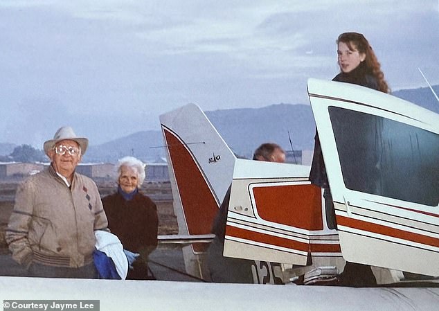 A faded photograph shows a smiling young girl stepping out of a tiny red and white plane as her proud grandparents look on.