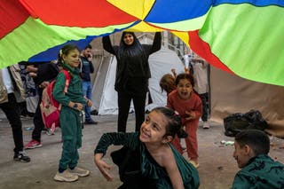 Pictured: Children play in yard of a school used as a temporary shelter for displaced people in Beirut