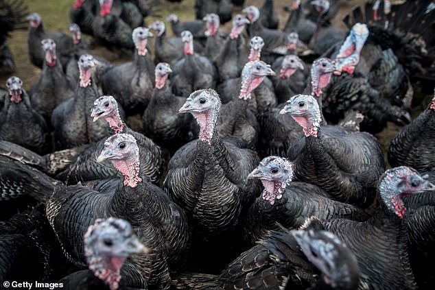 Families looking to serve a homegrown turkey can tell the difference by checking the bottom of the packaging or visiting the retailer’s website (Stock photo of turkeys in a supermarket)