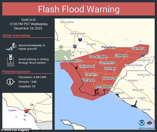 Los Angeles is expected to be especially hard hit by the incoming winter storms, with a severe flood warning in place for the area until 12pm on Wednesday. Hundreds of residents in at-risk neighborhoods have been warned to ‘immediately move to higher ground’
