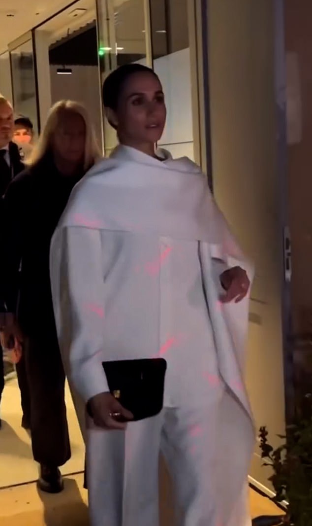 Meghan wore head-to-toe Balenciaga – a white silk button-down shirt, matching trousers and a striking white cape; her black heels peeking out below