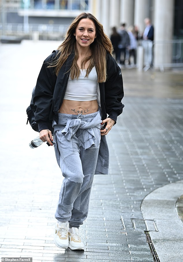 Mel C, 51, flaunted her abs in a crop top as she sported grey jogging bottoms, a white crop top and a black jacket as she joined BBC Breakfast in Salford to promote her new record, Sweat