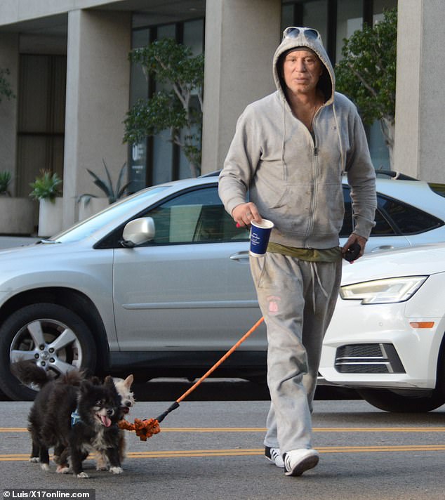 Mickey Rourke, 73, was pictured in downtown Los Angeles on Sunday walking a pair of dogs