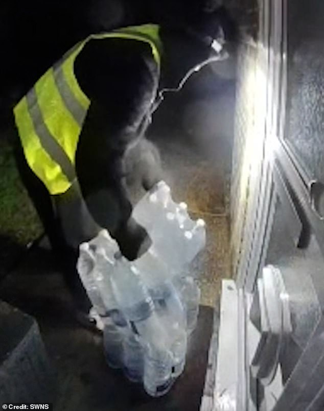The man can be seen delivering four cases of bottled water and taking a picture – before picking it back up again and walking away moments after