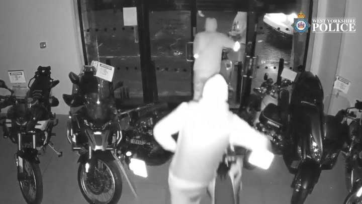 Footage released by West Yorkshire Police on Friday (13 March) shows seven individuals entering Colin Appleyard Motorcycles after they raided the entrance to the building using a Nissan Juke.