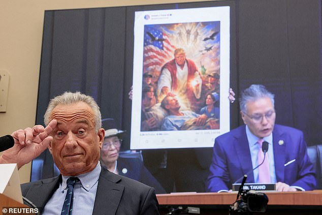 UHealth and Human Services (HHS) Secretary Robert F. Kennedy Jr. listens as Rep. Mark Takano (D-CA) presents an AI image posted by U.S. President Donald Trump depicting himself as a Jesus-like figure, which President Trump said was showing him as a medical professional