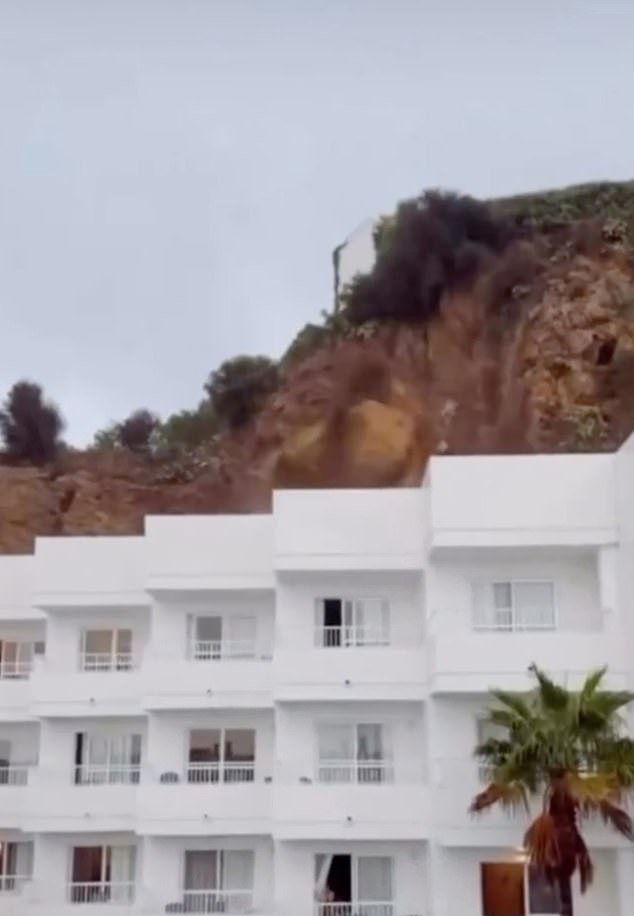In dramatic footage, rocks can be seen crashing down on the hotel in Ibiza as the island continues to experience extreme weather