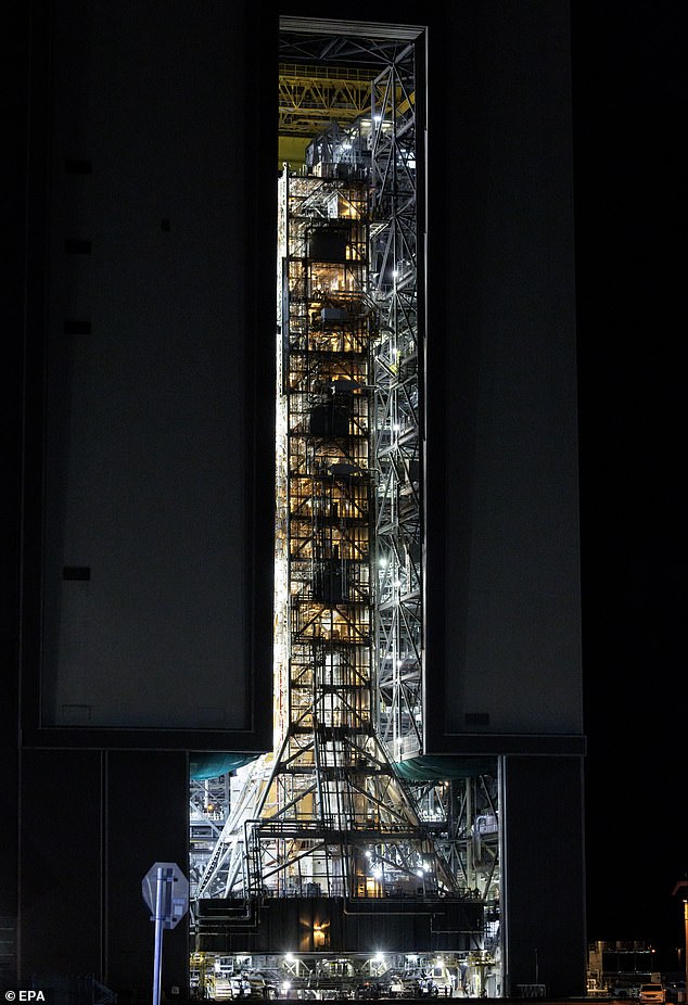 Pictured: Early in the morning on Saturday, January 17, NASA begins to move the Artemis II rocket out of the Vehicle Assembly Building at NASA’s Kennedy Space Center. Next month, it will be used for the first manned-mission to the moon since 1972