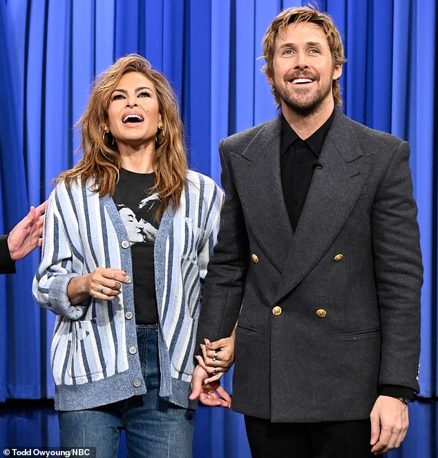Gosling, 45, brought Mendes, 52, out as a surprise to celebrate her birthday during the program, as she sported a casual-cool outfit that featured Gosling’s own blue and white striped Louis Vuitton cardigan that he has previously worn.