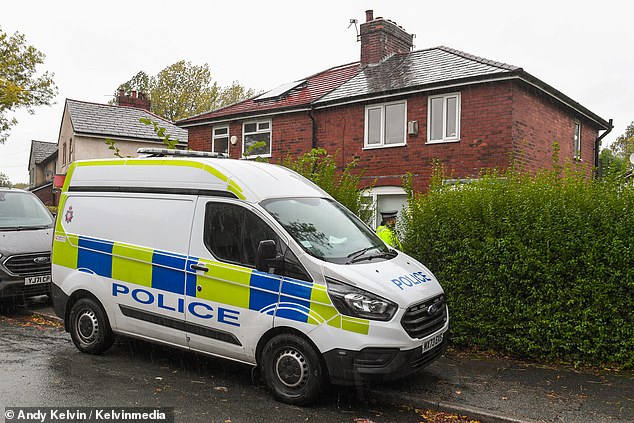 Police officers outside a home in Farnworth area of Bolton which was raided in connection with the terror attack at a Manchester synagogue