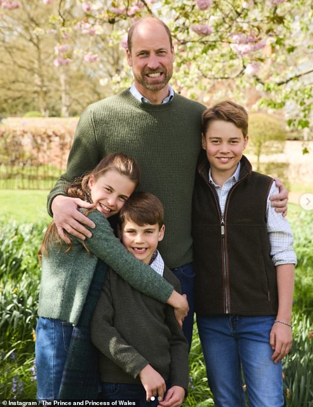 Sharing their love, Prince George, 11, Princess Charlotte , 10, and Prince Louis , seven, cuddled up to their dad as they posed for photos with Prince William to commemorate the special celebration