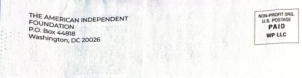 Virginia residents may have received a piece of mail from “The Virginia Independent,” which has all the trappings of a local paper. Upon closer inspection, however, a resident might notice that a group called the American Independent Foundation (a nonprofit notorious for these kinds of propaganda efforts) sent the “newspaper.” A reader will also see a United States Postal Service (USPS) postage-paid section listing WP LLC as the payer.