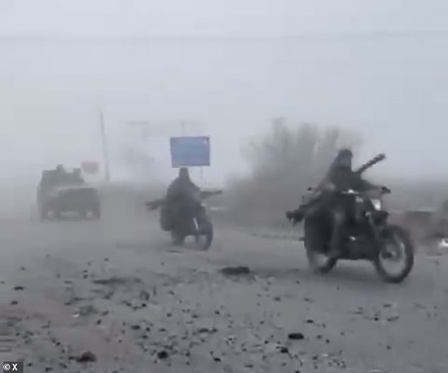 The video, shared by the Kyiv Post, shows soldiers clinging to battered vehicles and motorbikes as they roll down a debris-strewn road. A broken drone lies by the roadside as the column disappears into the mist.
