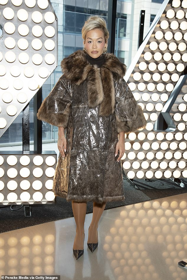 Rita Ora stunned in a dramatic fur-trim coat as she attended a junket in New York on Tuesday ahead of hosting Dick Clark’s New Year’s Rockin’ Eve