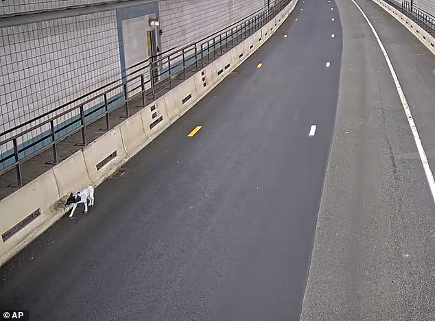 Surveillance footage from the Massachusetts Department of Transportation showed a black and white pup frolicking toward oncoming traffic on the left shoulder of the Ted Williams Tunnel Thursday morning.
