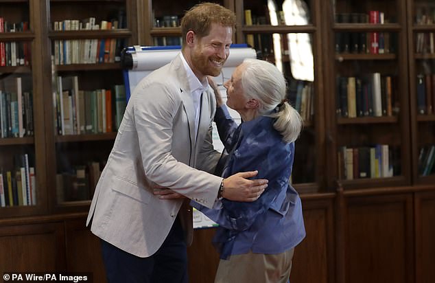 The Duke of Sussex hugs Dr Jane Goodall as he attends her Roots & Shoots Global Leadership Meeting at Windsor Castle in 2019
