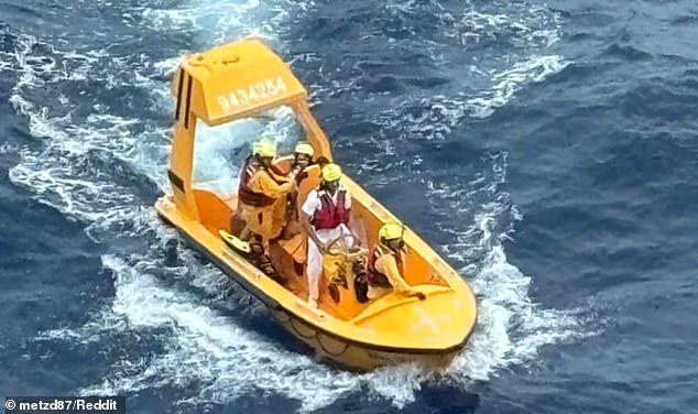 Pictured: The ship’s crew taking the father and daughter back to the Dream after plucking them from the ocean. The girl is sitting on the knee of the ship’s doctor being examined