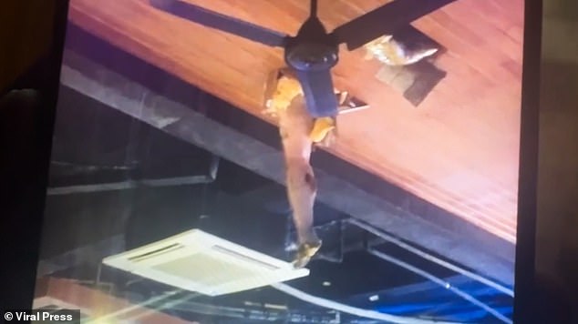 Paramedics said they found the tourist in a dazed state and covered in excrement while half-lodged in the ceiling.