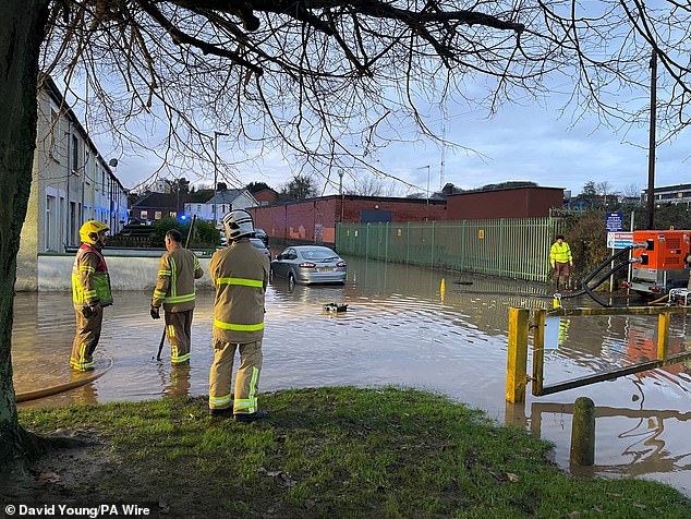 Firefighters work to pump water away from flooded residential streets near Moat Park in Dundonald on the outskirts of Belfast after Storm Bert battered the UK on Saturday