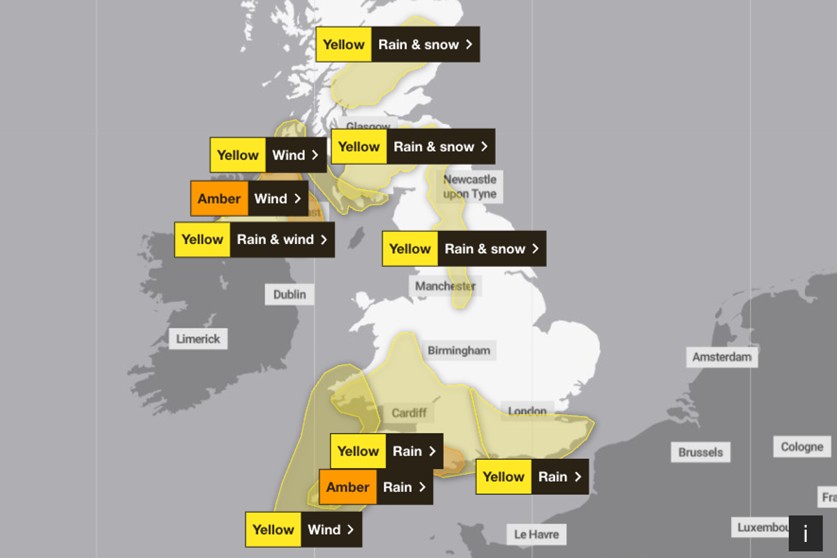Several weather warnings have been issued including amber warnings for south-west England and the eastern coast of Northern Ireland for rain and wind.