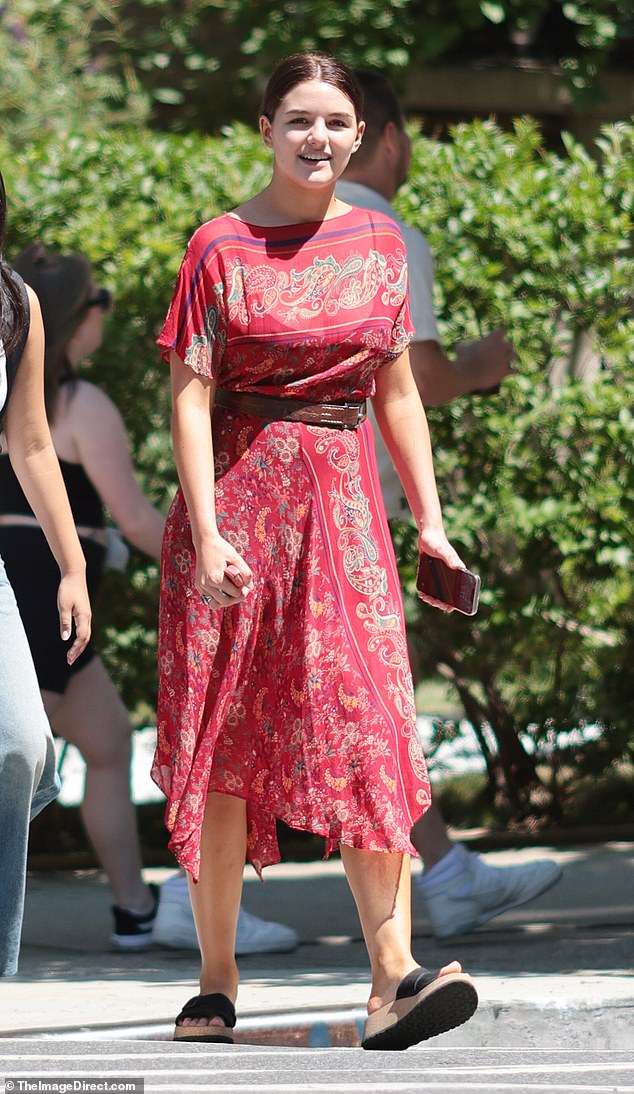 The 19-year-old college student was spotted in a patterned red dress accented with a brown leather belt around her waist
