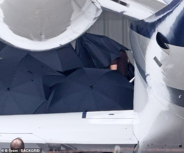 Her security could be seen unloading a few small bags from her plane as well as carefully handling a garment bag and one handler carried a large white box