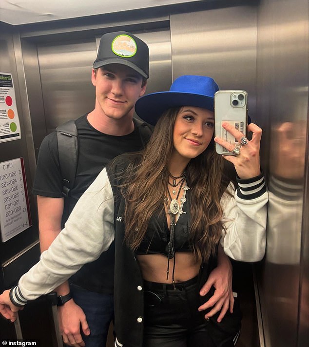 In one snap, a cowgirl hat wearing Baugh is pictured locking lips with Coley in a bar; while in another the pair are kissing while she is holding what appears to be a bottle of sparkling wine with the message ‘Opry Invite 12/16/24’ on the bottle’s label.