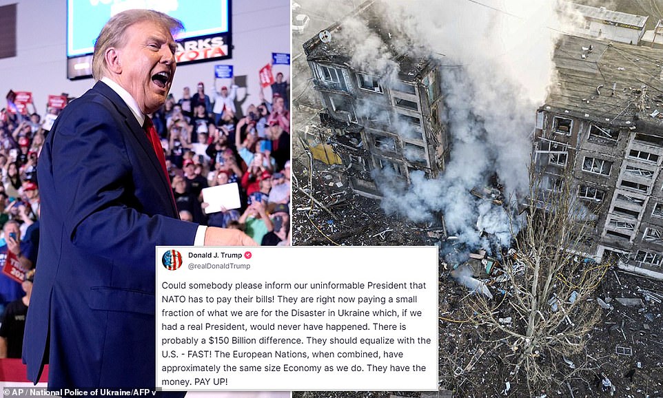 ‘Could somebody please inform our uninformable president that NATO has to pay their [sic] bills,’ he posted on his Truth Social platform. ‘They are right now paying a small fraction of what we are for the disaster in Ukraine which, if we had a real president, would never have happened. There is probably a $150 billion difference. They should equalize with the U.S. – fast! ‘The European nations, when combined, have approximately the same size Economy as we do. They have the money. Pay up!’ The message seemed to cover two of Trump’s constant complaints, that NATO nations are not meeting their defense spending commitments and that Washington is footing a disproportionate amount of the cost in Ukraine.