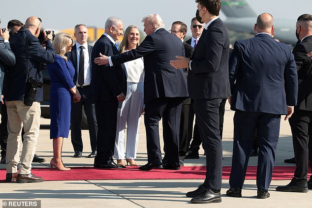 Trump also said he would be ‘proud’ to visit Gaza. Speaking before he arrived, he said: ‘Everybody is happy, whether it’s Jewish or Muslim or the Arab countries – every country is dancing in the streets.