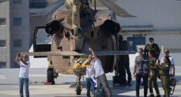 Defence minister Israel Katz said today: ‘The State of Israel and the security establishment embrace our first seven hostages returning home, including IDF soldier Matan Angrest. We await all of them with excitement and great love.’
