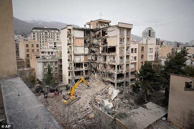 Iranian Red Crescent emergency workers use a bulldozer to clear rubble from a residential building that was hit in an earlier US-Israeli strike in Tehran on Monday
