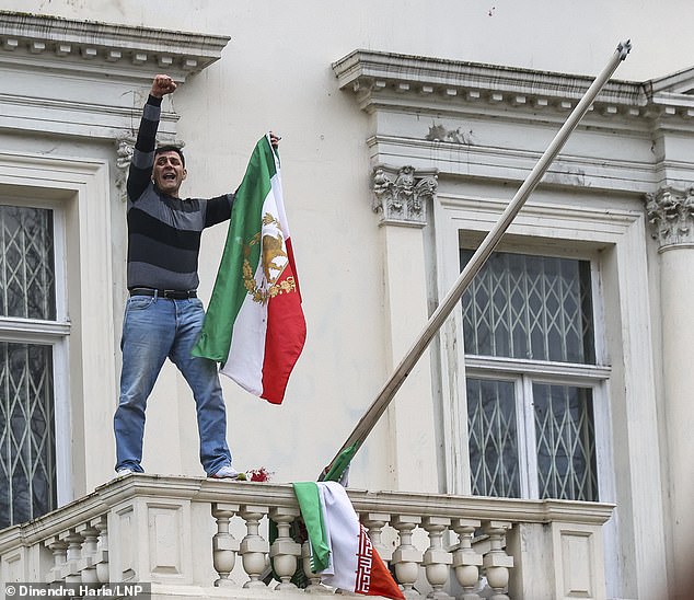 In London on Saturday a male protester was seen climbing onto the balcony of the Iranian embassy in Kensington and triumphantly tearing down the flag of the current regime.