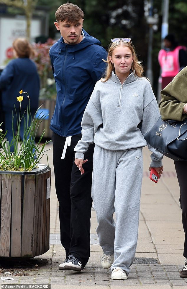 Meanwhile, professional footballer Callum, 22, stepped out in black trousers, a crisp white T-shirt which he layered under a blue raincoat.