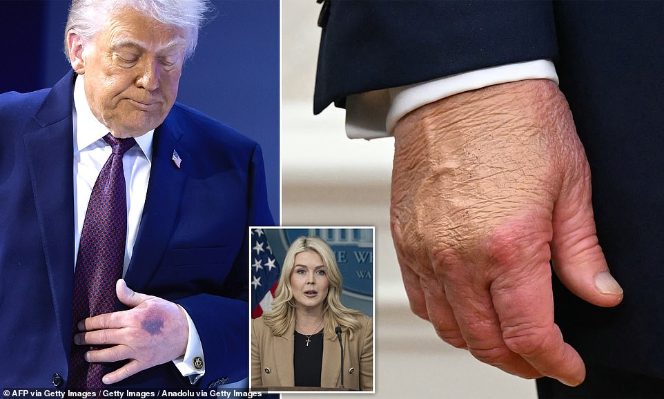 The White House has a new reason for why Donald Trump’s hands are consistently bruised. The President’s Press Secretary, Karoline Leavitt, told CBS News that Trump ‘hit his hand’ on the corner of the signing table at the Board of Peace event on Thursday in Davos, Switzerland, ‘causing it to bruise.’ The noticeable contusion was seen on Trump’s left hand, which is not the one normally covered with makeup to conceal the discoloration of a bruise. Previously, Leavitt has said that Trump’s right hand is chronically bruised because of the frequency in which he shakes people’s hands.