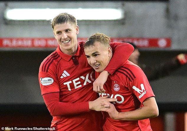 Winger Topi Keskinen (right) celebrates scoring in Aberdeen’s 1-0 victory against Hearts