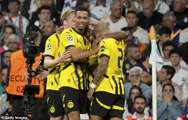 Jamie Gittens (centre right) made history when gave Borussia Dortmund a 2-0 lead during the first-half at the Bernabeu