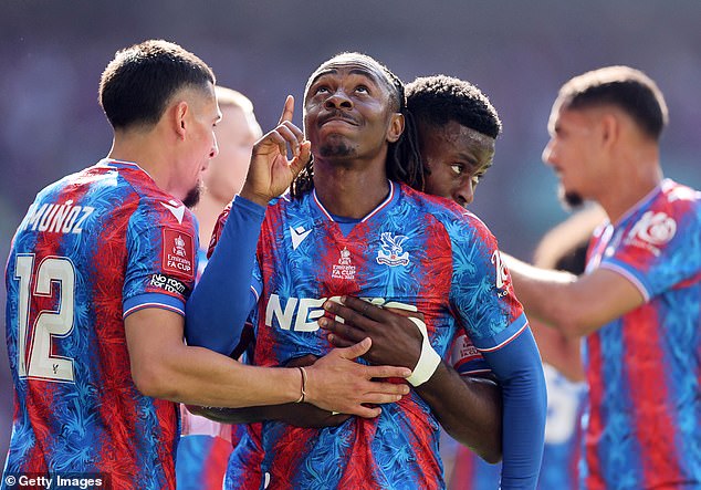 Eberechi Eze celebrates the goal which saw Crystal Palace win last season’s FA Cup final