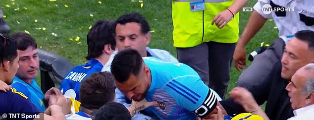 Boca’s substitute goalkeeper Leandro Brey pulled his skipper away from the angry fan