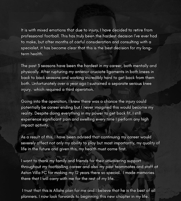 His statement, meanwhile, continued: ‘I want to thank my family and friends for their unwavering support throughout my footballing career and also my past teammates and staff at Aston Villa FC for making my 12 years there so special.