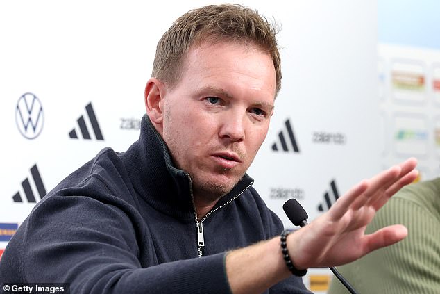 He explained his damning decision at a press conference on Thursday, saying: ‘Jonathan Tah will replace him [Kimmich]. We appointed a team council before the Nations League – not many of them are left because some are injured.