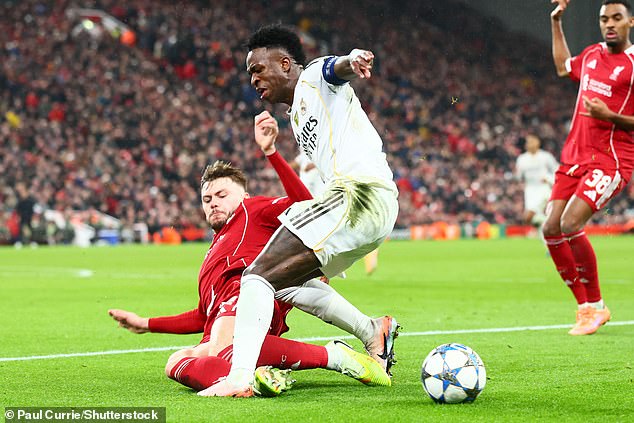 Arguably, Vinicius should have been sent off in the first half. He was rightly booked on 23 minutes for a tug on Bradley and, then, the Brazilian clearly threw himself to the floor when muscled off the ball by the Liverpool right back. Why no second yellow?