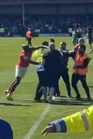 The FA are looking into both incidents and GMP issued a statement confirming that they are studying the footage, saying: ‘We are aware of a video that is circulating of a possible assault involving a player and we have linked in with both clubs and the National League. We will be further assessing the video and reviewing CCTV of the incident.’