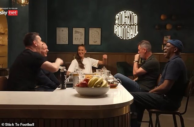 ‘Because of Ian,’ the hard-hitting pundit said with a straight face in reference to Aluko’s comments, leaving Scott, Wright, Gary Neville and Paul Scholes in hysterics.