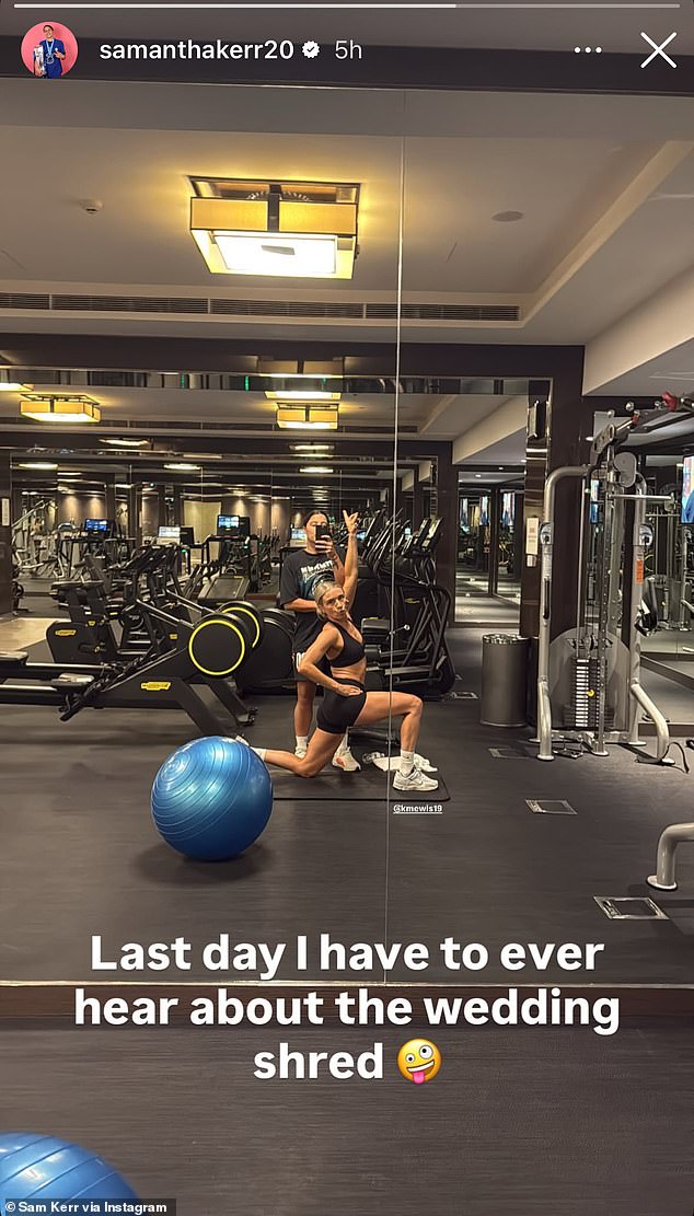 Sam Kerr and Kristie Mewis had time for a quick gym session on Tuesday, as the soon-to-be newlyweds prepared to tie the knot at a private ceremony in Perth on New Year’s Eve.