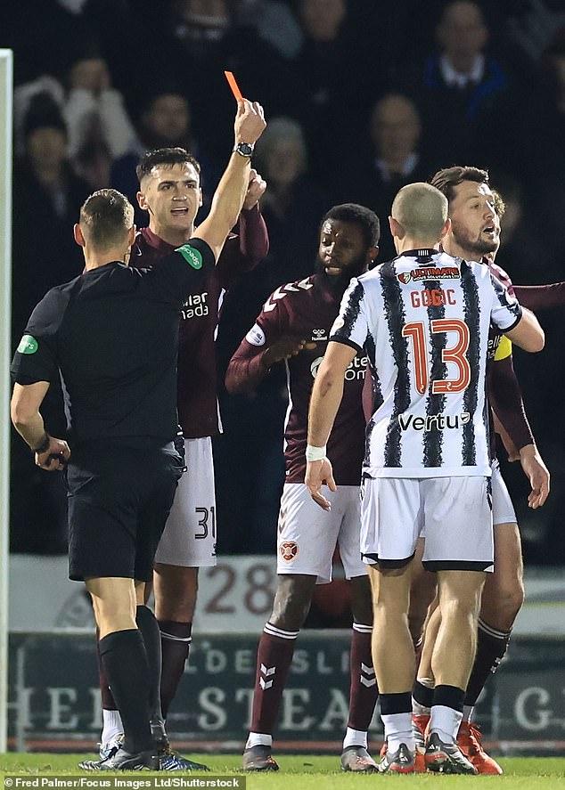Craig Halkett is shown a straight red card as Hearts were reduced to ten men yet again