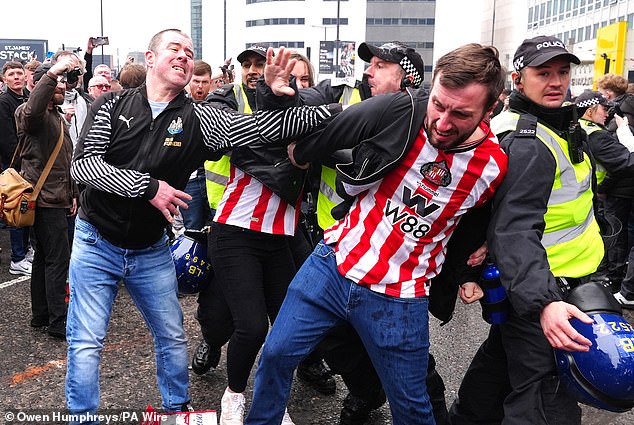 Sunderland fans spotted holding their heads after being struck by bottles thrown by Newcastle fans as supporters clash ahead of derby day