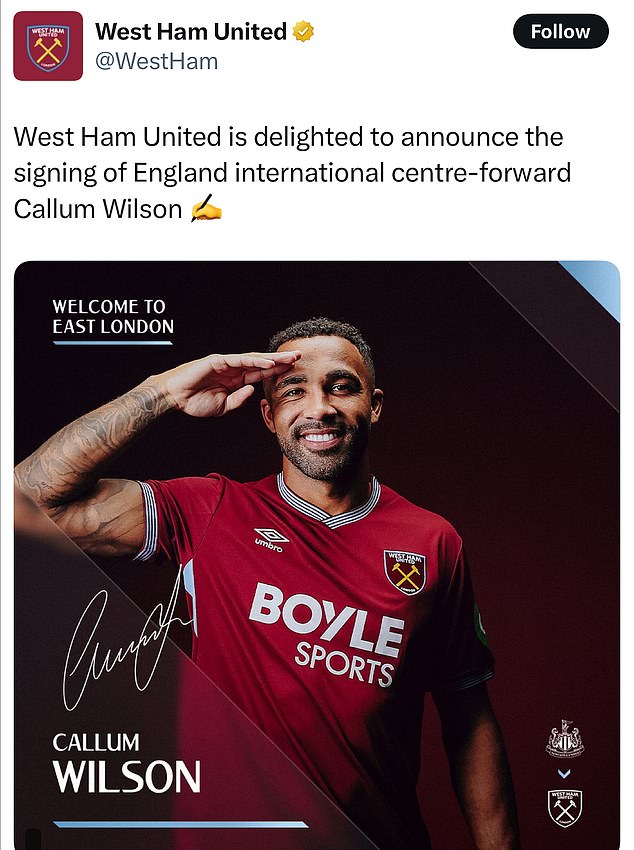 Responding to the announcement of the signing, one fan wrote: ‘delighted to welcome Wilson – a man who mocked our European trophy, said Michail Antonio would never play CL, and made a career out of scoring against us. Truly the West Ham way.