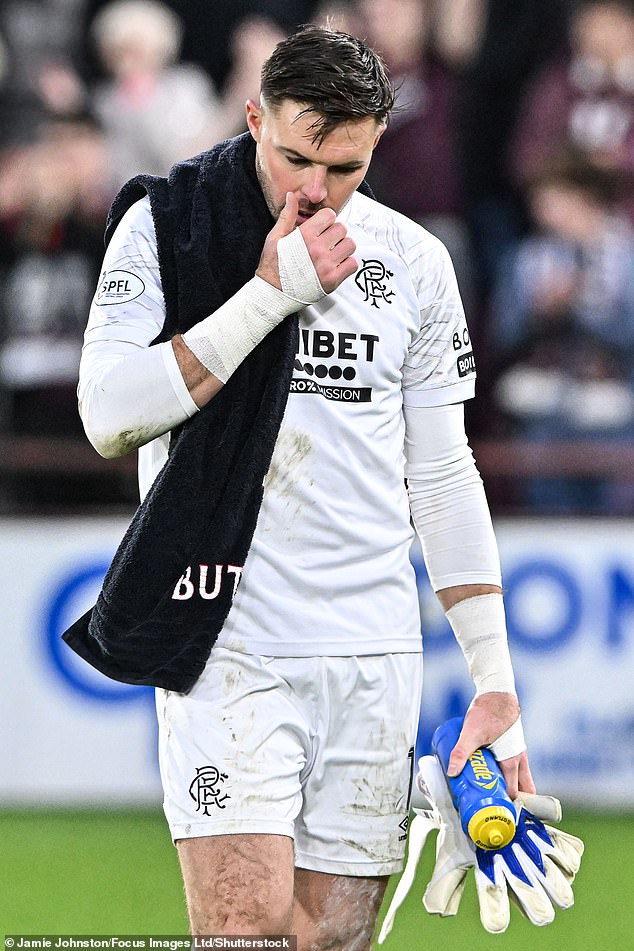 Rangers goalkeeper Jack Butland looks dejected after his side’s defeat to Hearts