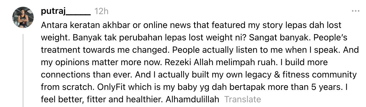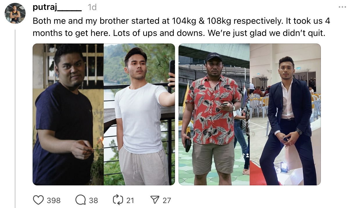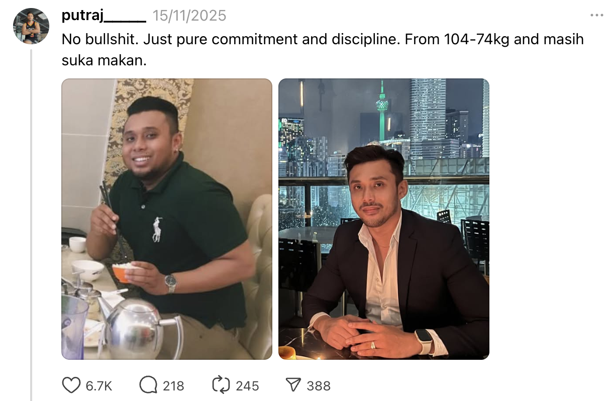 In an earlier post on Nov. 14, Putra said that he had gone from 104kg to 74kg.