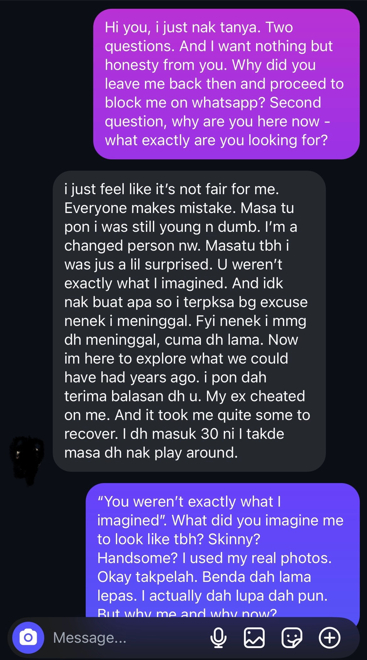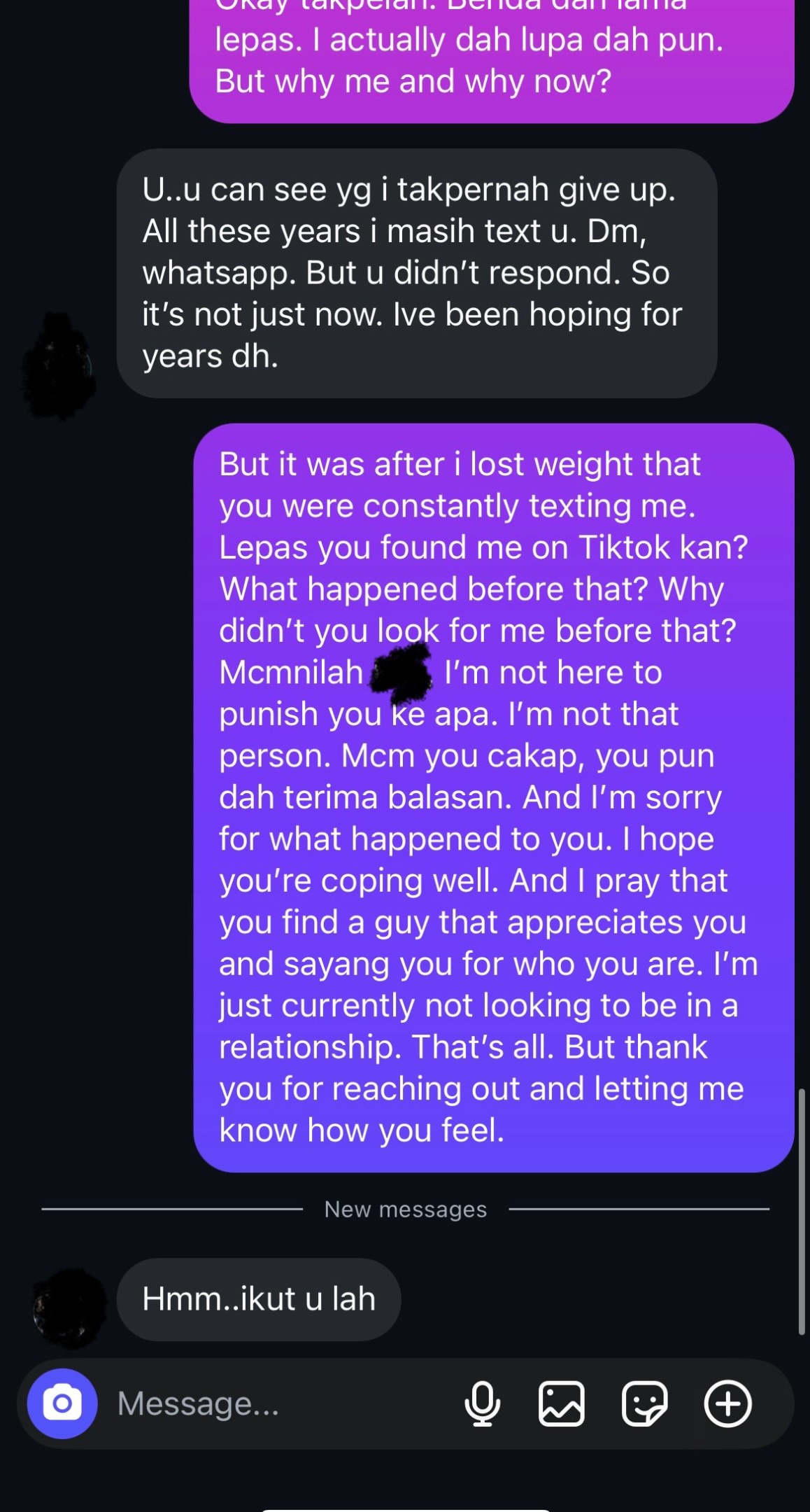 In her message, shared by Putra in his post, she had asked him if “there’s still a chance” for them “to continue what” they “once had”.
